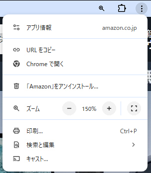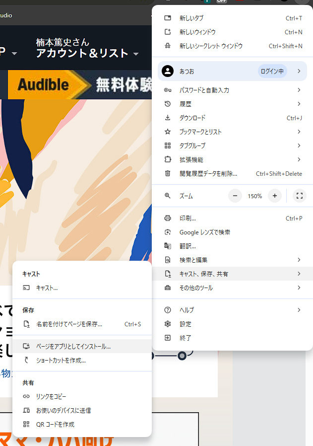 メニューの中から「キャスト、保存、共有」にマウスを合わせ、「ページをアプリとしてインストール」をクリックしてください。