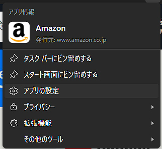 ちなみに、タスクバーやスタートメニューへのピン留めは、わざわざ設定画面までいかなくてもアプリのメニュー内にあるので、これがかなり便利です。
