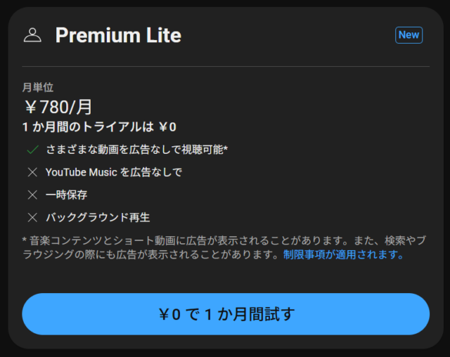 しかも注釈に書いてる通り「音楽コンテンツ、YouTube ショート、検索・サイト内を閲覧する際には広告が表示されることがある」というもの。